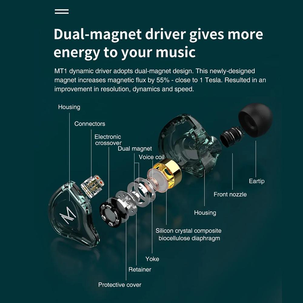 MT1 dynamic driver adopts dual-magnet design. This newly-designed magnet increases magnetic flux by 55% – close to I Tesla. Resulted in an improvement in resolution, dynamics and speed.