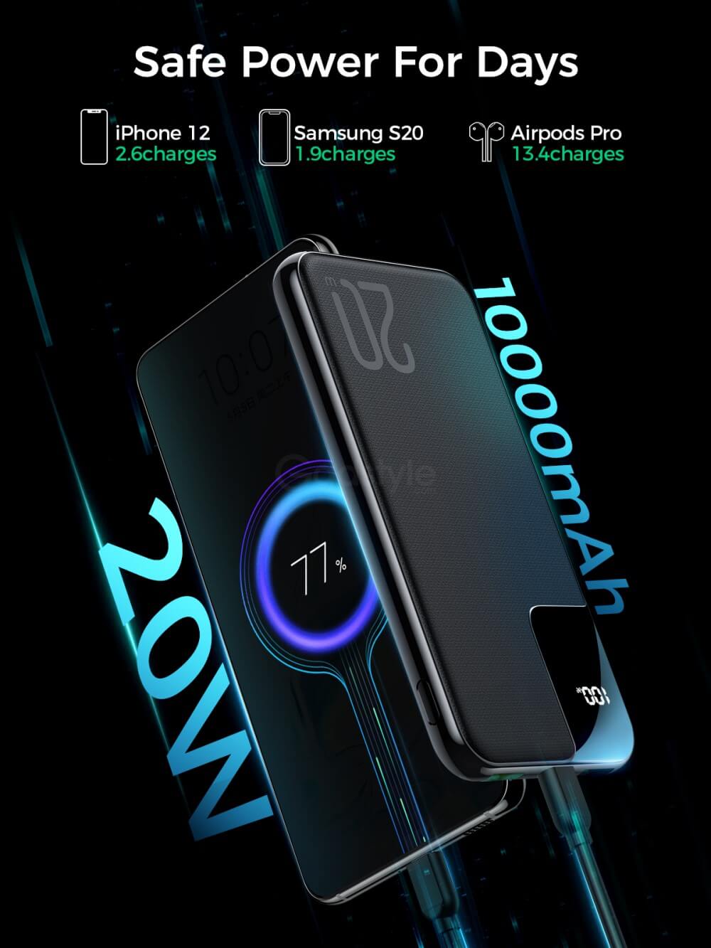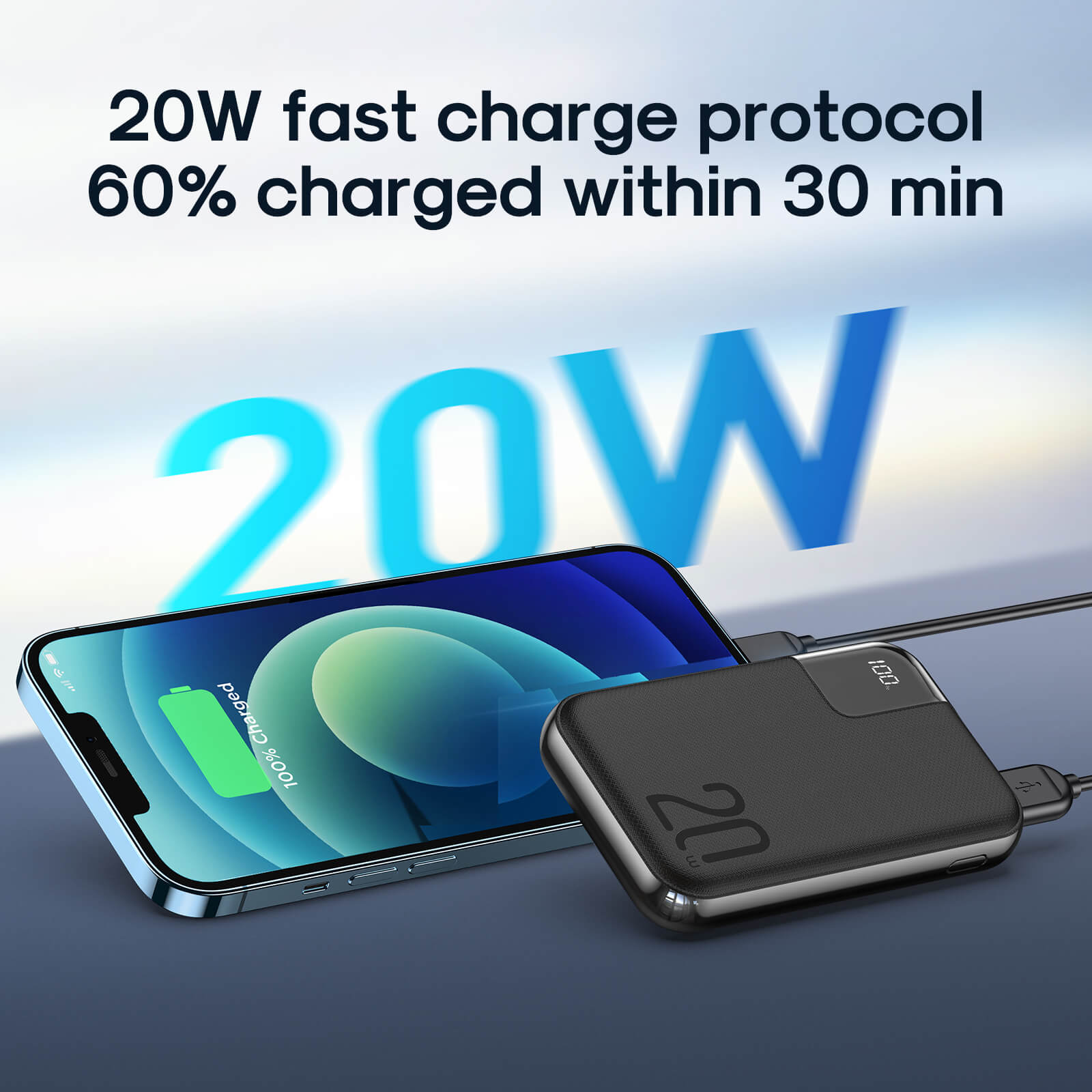 Two-way fast charge: QC input 18W, PD output 20W