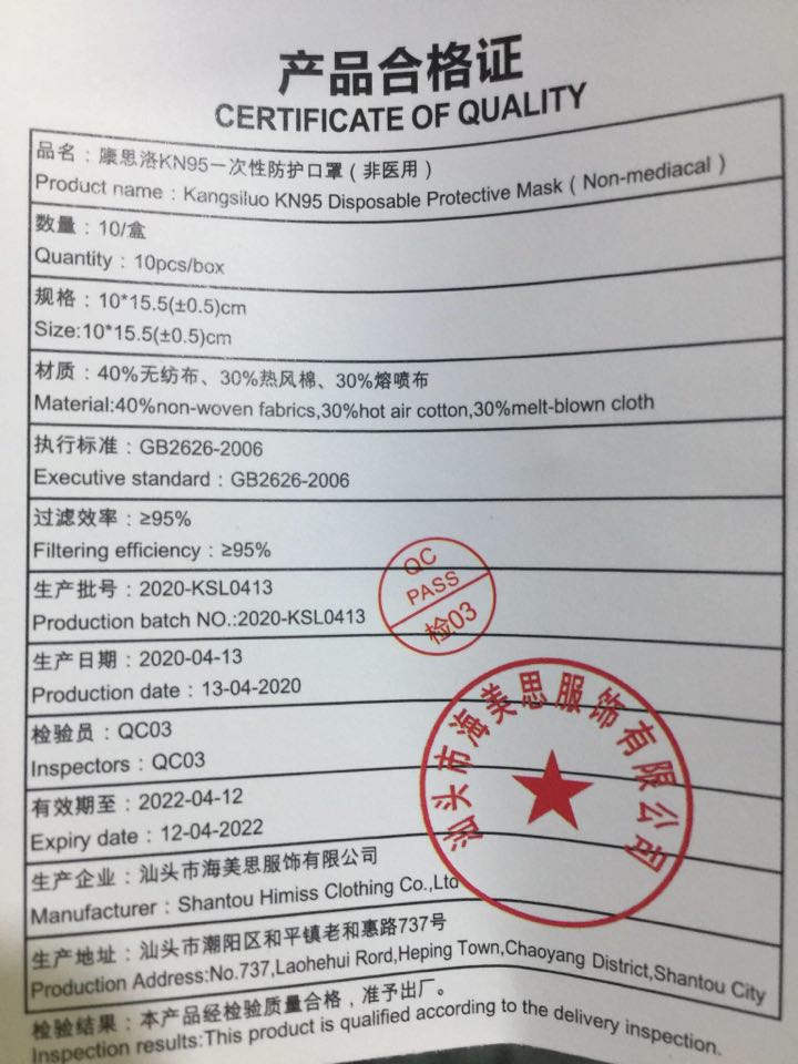Original KN-95 Mask with Certificate (1 PKT: 10PCS)