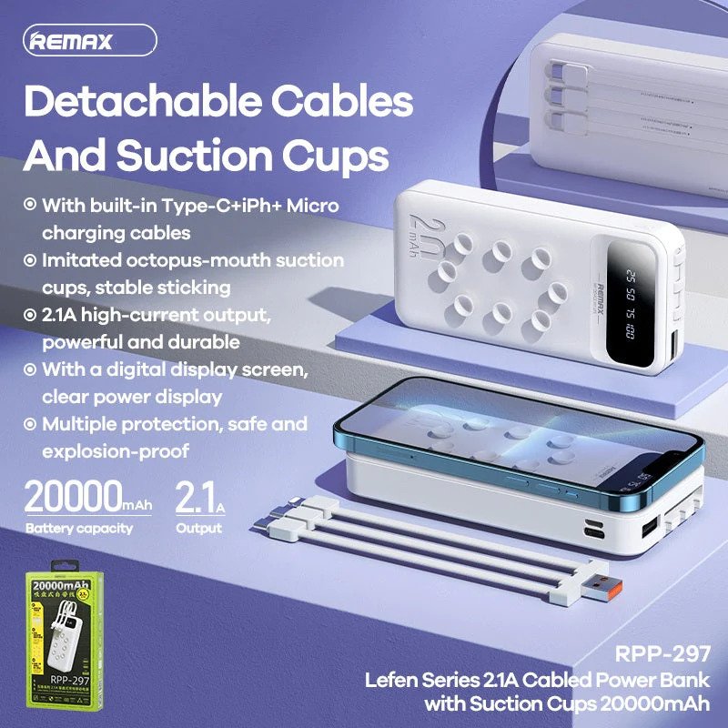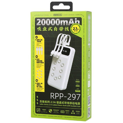 REMAX RPP-297 LEFEN SERIES 2.1A CABLED POWER BANK WITH SUCTION CUP 20000mAh 4 OUTPUTS 2 INPUTS